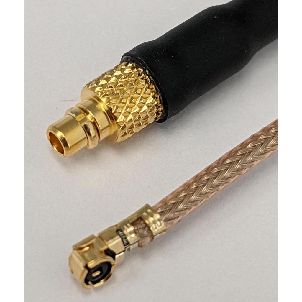 Flexible cable assembly, MMCX plug (male) to U.FL right angle plug (male), RG178, 10 inch.