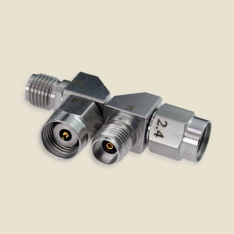 RF Adapter, 2.4mm Male to 2.92mm Female Right Angle up to 40 GHz with a 1.25:1 VSWR