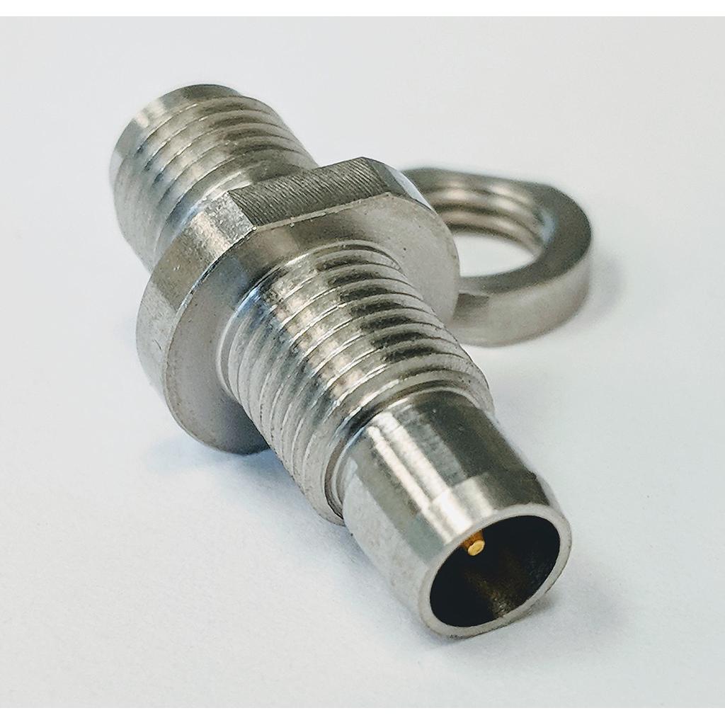 P1dB's P1AD-SAFBMMBD is a 50 Ohm RF adapter, SMA female(jack) to BMA male(plug), bulkhead mount. This adapter operates to 18 GHz with a max VSWR of 1.20.