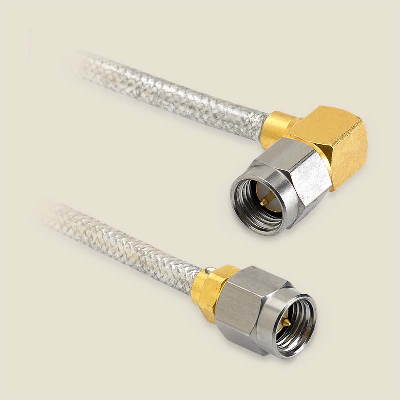 SMA Male to SMA Male Right Angle cable assembly using 141CC Conformable Coax, 12 inches long, Operating to 18 GHz.