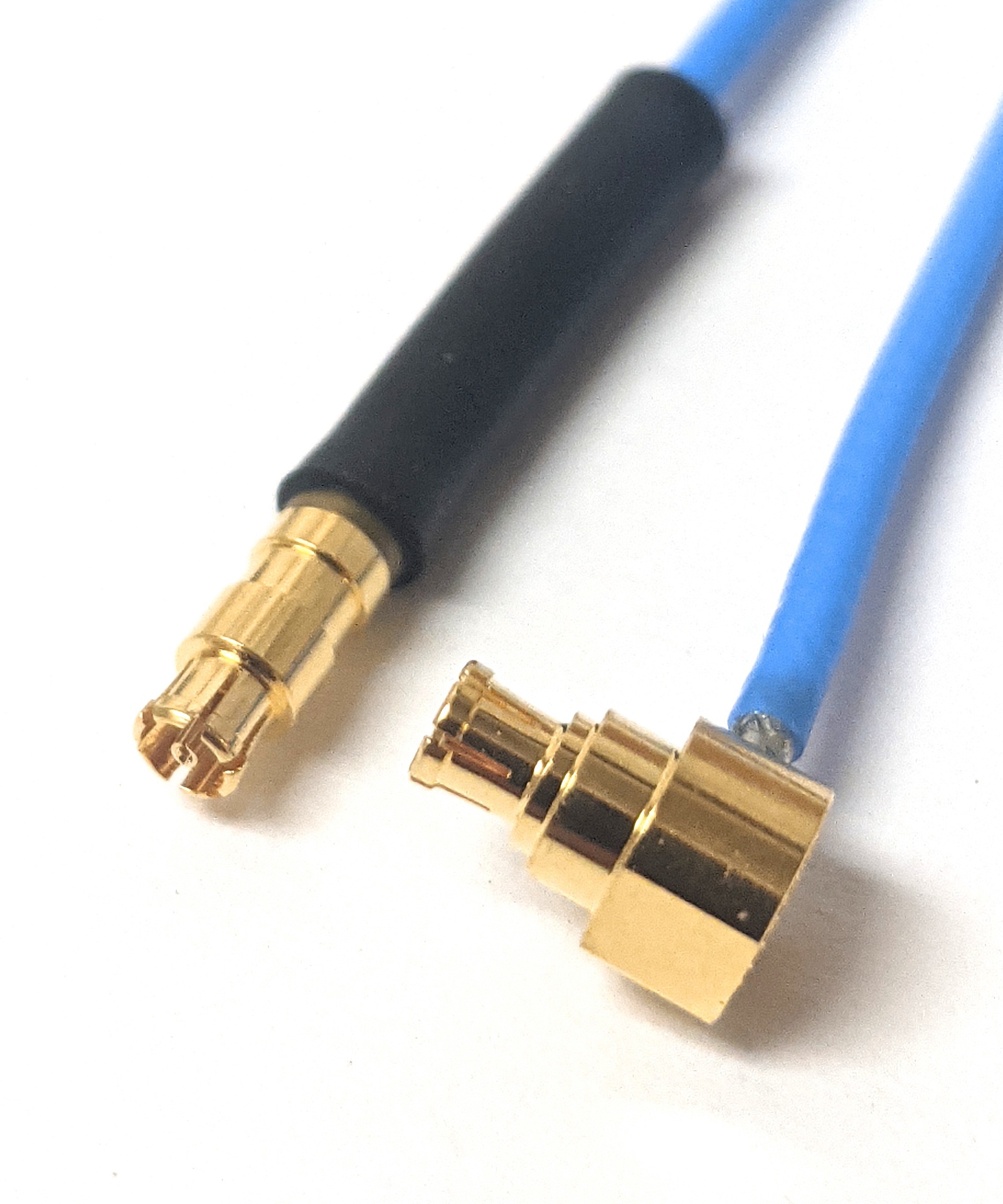 Cable Assembly, SMPM female right angle to SMPM female straight, .047 flex, 3.3 inch. Designed to mate with dual receptacle 3211-40024.